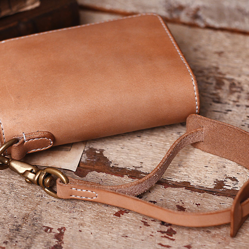 ハンドストラップと取り付け部分。金具は ヌメ革と最高に相性がいい 真鍮無垢の金具を使って仕立てています。カシメは使わずに、接続部は全て手縫いで縫い込んでいます。