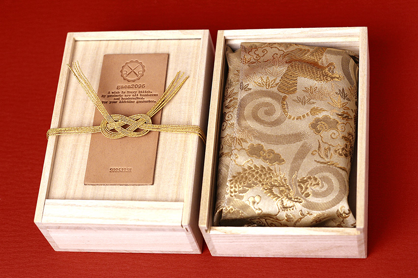「末長く」という想いを込めた水引で結び、最強開運日の日付が刻印されたヌメ革の札を配した桐箱。その桐箱を開けると西陣織に包まれた、開運財布とご対面いただけます。