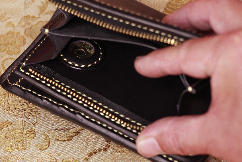 中から現れる開運財布。煌びやかな金糸を手縫いで縫い上げた極上ヌメ革財布。使うほどに艶を増す「黒」のヌメ革を採用した革財布で、金と黒の艶やかなコントラストをご堪能いただけます。